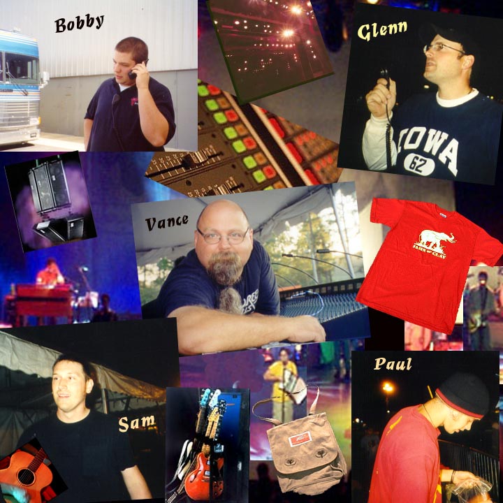 Meet some of the the crew for the 3 O'Clock Parade tour!- He's the man with a plan! As their Production Manager, Bobby has been with Jars since the Fall of 1996. He started in the midst of the "Flood" frenzy so he's seen it all. Bobby is an accomplished drummer and often jams with Steve for hours before concerts. His nickname is "Honyock." He said somebody called him that one day and it just stuck. If you squint your eyes, he looks a little like Ringo Starr! :) Meet Bobby Simmons! - Let there be light! Hailing from Clarksville, TN, Glenn is the lighting engineer. Ooo, ah, wow, nice! When not with Jars, he sometimes spotlights Bonnie Raitt. (Can you imagine a Raitt/Jars tour? Bonnie and Steve would probably be fighting over the red hair dye!) Taking care of Billy is Glenn's responsibility while they're on the road! Mind your rhino! The one and only, Glenn Felton! - Whenever he is not plotting several international monetary coups, he is the sound "genius" of Jars of Clay. The Jar guys don't really have any talent; it's just Vance working his magic! :Þ He's a "Mac addict" and will tackle any PC/Mac debate with fervor. Rumor has it, in a former life, he founded the band ZZ Top :) He's also been known to sport a ram's horn Viking helmet. Let's get ready to rumble...... Vance Powell - Sam, Sam, the guitar man. If he can't tune it, nobody can! :) Rumored to be the hardest working crew member on the 3 O'clock Parade Tour, Sam is Jars' guitar tech extraordinaire! He got a new hair style especially for the fall tour! ... Mr. Sam Shifley! (Everybody play air guitar in lieu of applause!) - "Thirty-one, thirty-two, thirty-three ..." Don't mind him; he's just counting something! Paul is Jars' merchandise specialist! He likes Pearl Jam and has a brand new orange "iBook" notebook. Ask him about the old days when he had an "afro." ... Paul "don't touch the hair" Stanfield! (Facts by Libbyp3; embellishments by Jokes-R- Us)