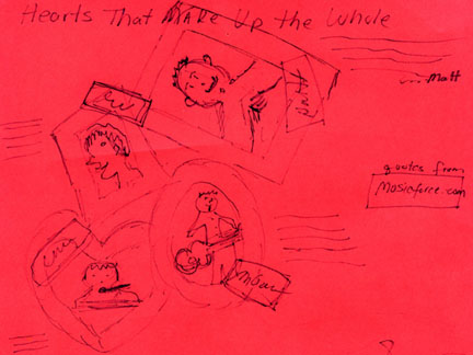 BEHIND THE PAGES When Libby came up with the idea for the "Hearts That Make Up The Whole" page featured in our JARTICULATE section, this is the sketch she did to convey her concept to me. I like it so much, I keep it displayed near my desk. I thought you might get a kick out of it, too! Write Libby to let her know what you think! --Kat, the Webmooster |