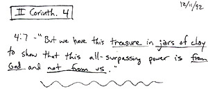 Following Christmas vacation, the four of them decided they'd like to write additional songs to add to their live repertoire and satisfy the requirements of their recording studio class, but thought it would be appropriate to give a name to these collaborations. Charlie recalled a Bible verse he had read which discussed the frailty of man, and the irony that this amazing life has been breathed into our frail, physical bodies by our Lord. This passage, which related the struggles of man and the testing of our wills and bodies, which ultimately provides us the strength to endure the hardships of life, included the phrase "Jars of Clay". The phrase was penned by the Apostle Paul, and was from 2 Corinthians, chapter four verse seven: "But we have this treasure in jars of clay, to show that this all-surpassing power is from God and not from us". The band thought that was a good way to keep themselves humble - to have a band name that would force them to continually realize that all of their blessings had come from God, including this talent to write songs that their classmates enjoyed. So in January of 1994, Jars of Clay was born.