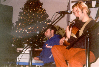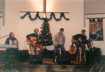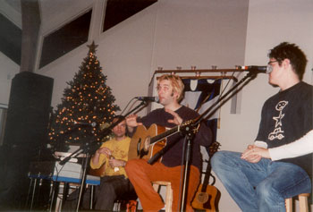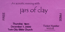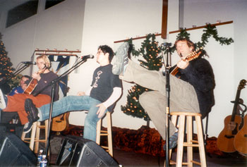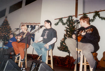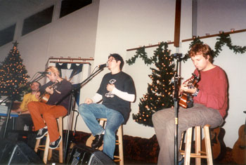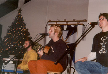 The tappedinto.comUnplugged Concert Experience December 7th, 2000 Twin City Bible Church Urbana, Illinois Wouldn't it be great to hear the Jars in an intimate setting with just their acoustic guitars and a keyboard instrument or two? Kind of like their early days back at Greenville College, before they had a bass player or drummer. Maybe reminiscent of those early acoustic shows at Café Milano in Nashville when "Flood" was just starting to gain popularity. A unique Jars concert like this would have ticket prices through the roof, right? Of course it would be even better if it was free! I knew we had scored big when The University of Illinois at Urbana-Champaign won the Jars tappedinto.com free unplugged concert contest. We were going to play host to a very special Jars show right in our own backyard. After many scheduling conflicts on both our side of things and the Jars' side of things, we worked out the day, time, and most importantly, place. The Jars management decided that a church on campus would serve as the best and most intimate venue, so Twin City Bible Church, a church that is made up almost entirely of college students, was chosen for the show. Since the show wasn't a part of tour, things were quite a bit different for this performance than a typical tour performance. They did drive up from Nashville on their tour bus as usual, but they didn't bring their equipment bus. Speaking of "things" they didn't bring, they didn't bring their bass player, Aaron, or their drummer, Joe. It was just the four guys that form the core of the group, doing things like the old days in Greenville. The Jars arrived in Urbana early morning the day of the show to hang