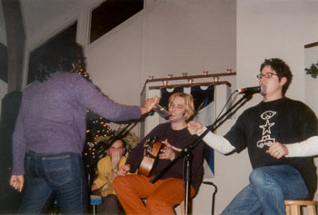 After all of the commotion died down a little, someone requested "Weighed Down." The Jars didn't seem to remember this one very well, and Dan even completely forgot the lyrics toward the end of the first verse! In keeping with the laid-back attitude to the evening, this was no big deal to the fans in attendance, and a lady in the audience shouted out "I have the lyrics with me!" So Dan told her to "come on down", and she handed Dan the liner notes from Much Afraid. She mentioned that she had the other two albums also if he needed them! That was probably the funniest thing that happened that night! So "Weighed Down" kind of fell apart, and they moved on. I was really hoping to hear them play "Smells Like Rudolph", so my wife and I yelled out "Rudolph!" which Steve heard and seemed to like the idea of playing. Charlie said "this is our request to ourselves" and Steve said that they played that song first at Greenville college, and that is was probably the reason they only went to school there a couple of years. They played "Smells Like Rudolph", and they really seemed to be enjoying themselves. Most of the audience hadn't heard them play this one (even though a really nice guy I met that night named Keith went to school with the Jars and was there for the first performance of that song back in 1993 at Greenville), so the crowd was having lots of fun. Steve broke down laughing a few times during the song, and Charlie mixed in some "Meows" with Dan and Steve's "Yeahs", making it the craziest and funniest song they played that night.