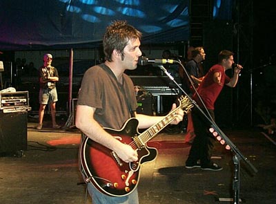 Steve Mason, with Dan Haseltine and Matt Odmark to his left at Cornerstone '99